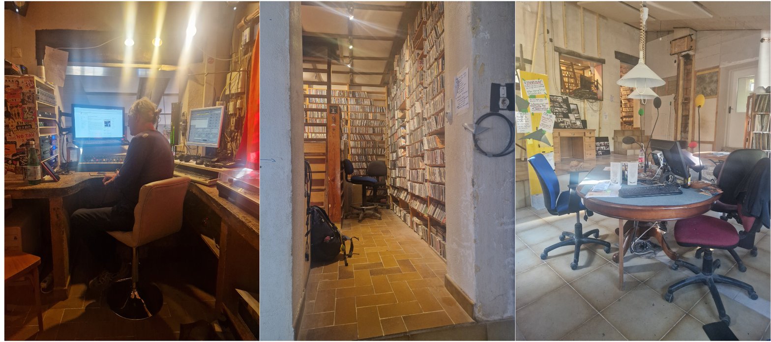 À l’intérieur, une grande pièce et une grande table équipée de micros pour accueillir des invité·e·s. La technique est entourée d’une multitude de CD, de vinyles, de stickers en tout genre et d’archives. Si la radio est ouverte aux habitant·e·s des alentours, qui proposent des émissions bénévoles, la gestion quotidienne repose encore largement sur certains membres de la communauté, qui se réunissent une fois par semaine. Tous les bénévoles sont invités une fois par mois.
