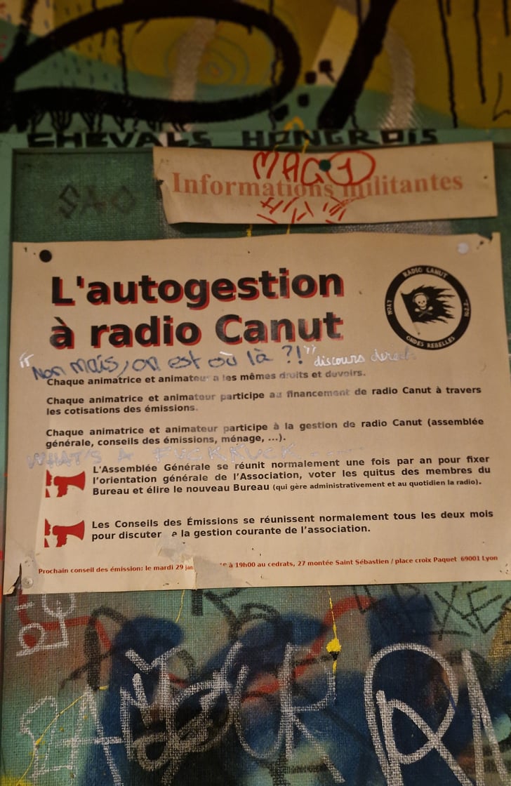 Finalement, à Radio Canut, c’est aussi expérimenter la vie collective avec ses hauts et ses bas. Les membres les plus ancien·ne·s perçoivent malgré tout une baisse de l’engagement, avec peu de personnes qui s’impliquent réellement dans la gestion quotidienne et financière. Malgré tout, la radio continue à vivre, à débattre et à produire environ 45 émissions par semaine. Les contenus et les orientations de toustes ne font pas consensus entre les producteurices plus ou moins engagé·e·s politiquement, mais c’est aussi la richesse de cette radio.