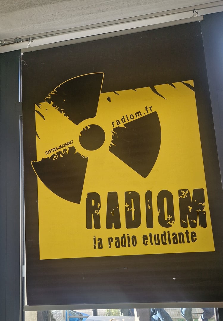 Radiom, la radio active, fait partie du grand réseau de Radio Campus France, qui rassemble les radios à l’interstice entre l’université et la cité. Elle a été créée par des étudiant·e·s en audiovisuel à Castres (et oui, il y a des étudiant·e·s à Castres) en 2007. La radio n’a jamais eu de locaux sur le campus : elle a navigué d’un local à l’autre en fonction des opportunités, notamment avec la MJC (Maison des Jeunes et de la Culture), avant de s’installer dans le bâtiment actuel, qui regroupe un espace de coworking, un restaurant et une ressourcerie.