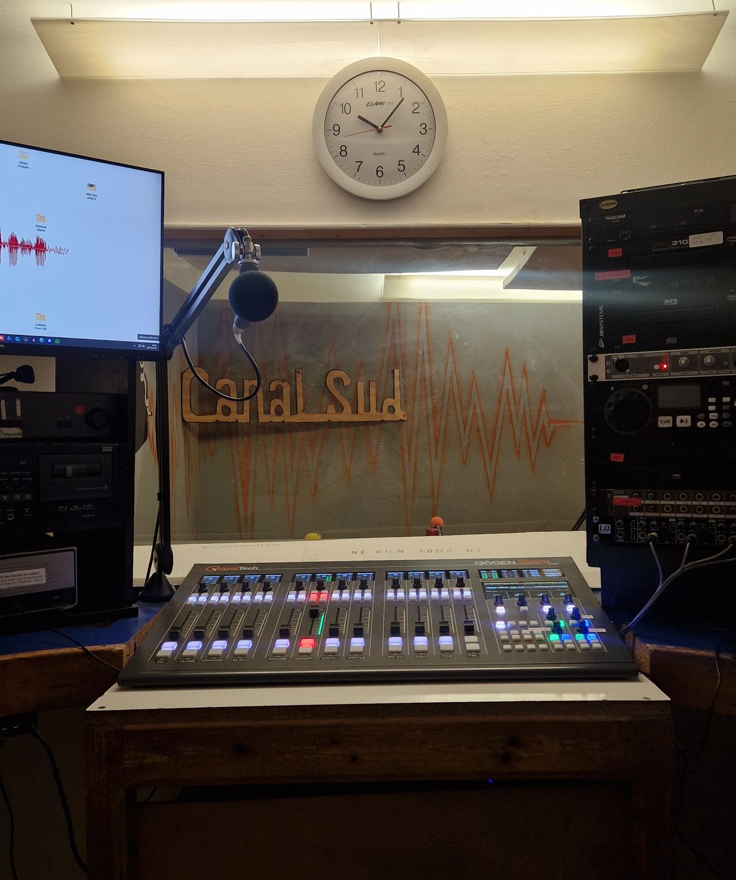 Actuellement, la radio s’appuie surtout sur le bénévolat pour fonctionner, les moyens financiers ne permettant pas d’avoir plus d’un·e salarié·e. Et le salariat à Canal Sud est un peu particulier : 2 salarié·e·s s’alternent sur l’année. L’un en hiver-printemps (le plus ancien) et l’autre en été-automne. C’est un arrangement trouvé avec le premier salarié qui poursuit d’autres activités. Quant à moi, j’ai pu rencontrer Céline juste avant la fin de son contrat CDD de remplacement pour quelques mois. Elle espère que ce contrat sera renouvelé l’an prochain, sans pouvoir en avoir la certitude. Ancienne journaliste dans la presse régionale, elle se consacre aujourd’hui à plusieurs projets de création sonore et a pu retrouver une forte indépendance à la radio après des expériences décevantes. L’organisation est donc précarisante, mais a le mérite d’offrir une grande liberté aux salarié·e·s.